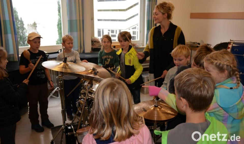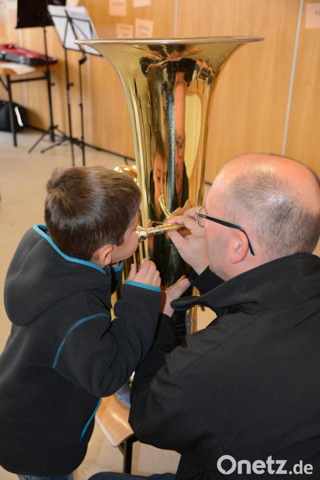 Dort erklärte ihnen Vorsitzender Simon Lösch zusammen mit sechs weiteren aktiven Musikern die verschiedenen Blasinstrumente und das Schlagzeug. Dazu spielten die Mitglieder des Blasmusikorchesters den Kindern kurze Stücke auf ihren Instrumenten vor und zeigten ihnen, wie die Töne erzeugt werden. Die Schüler durften jedes der vorgestellten Instrument selbst ausprobieren, was ihnen natürlich sehr viel Spaß machte.