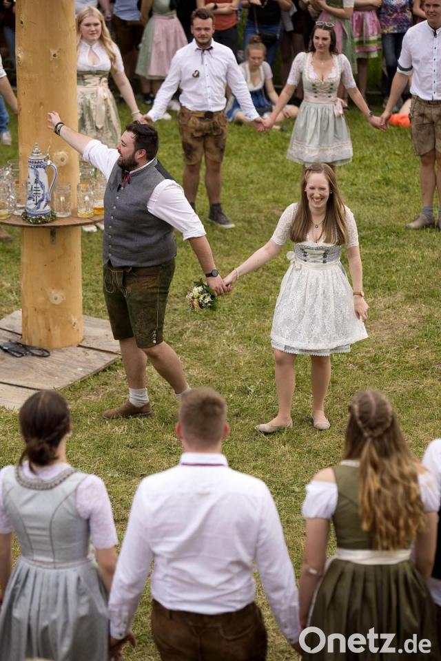 Der Festgottesdienst in der Martinskirche, musikalisch gestaltet von Maria Birner, eröffnete den nächsten Tag. Die Blasmusik gab beim Frühschoppen am Festplatz zünftige Lieder zum Besten. Nachdem die Burschen ihre Moidln an den verschiedenen Stationen eingesammelt hatten, zeigten alle zusammen die von Peter Fink einstudierten Tänze. Beim Walzer hatten Tanja Rosensprung und Julian Bauer den Blumenstrauß in ihren Händen. Das Oberkirwapaar wurde gebührend gefeiert und musste dann auf die Leiter klettern, um die Süßigkeiten vom Baum zu holen. Anschließend übernahmen die „Barsprinter“ die musikalische Unterhaltung.