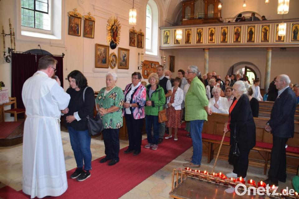 Hatte zum Frühgottesdienst der gestrige Nebel noch einige Besucher abgehalten, so füllte sich der Platz um die Kirche zum Hauptgottesdienst zusehends. Mit Glockengeläut und einer kräftigen Portion Weihwasser begrüßte Pfarrvikar Christian Preitschaft die Wallfahrer aus Ursulapoppenricht und Hahnbach am Eingang zum Festplatz.