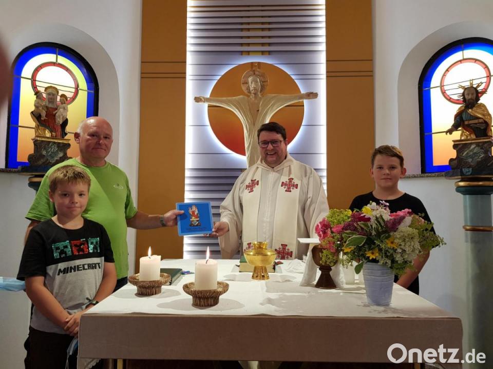 Nach den Fürbitten trag Annemarie Bock die Lesung vor. Am Schluss bedankte sich der Vorsitzende des Kapellenfördervereins Gebhardsreuth, Reinhold Baier, bei Pfarrer Klösel für das erste Patroziniumsamt, dass er mit ihnen gefeiert hat, und überreichte ein Büchlein wie diese neue Kapelle entstanden ist.