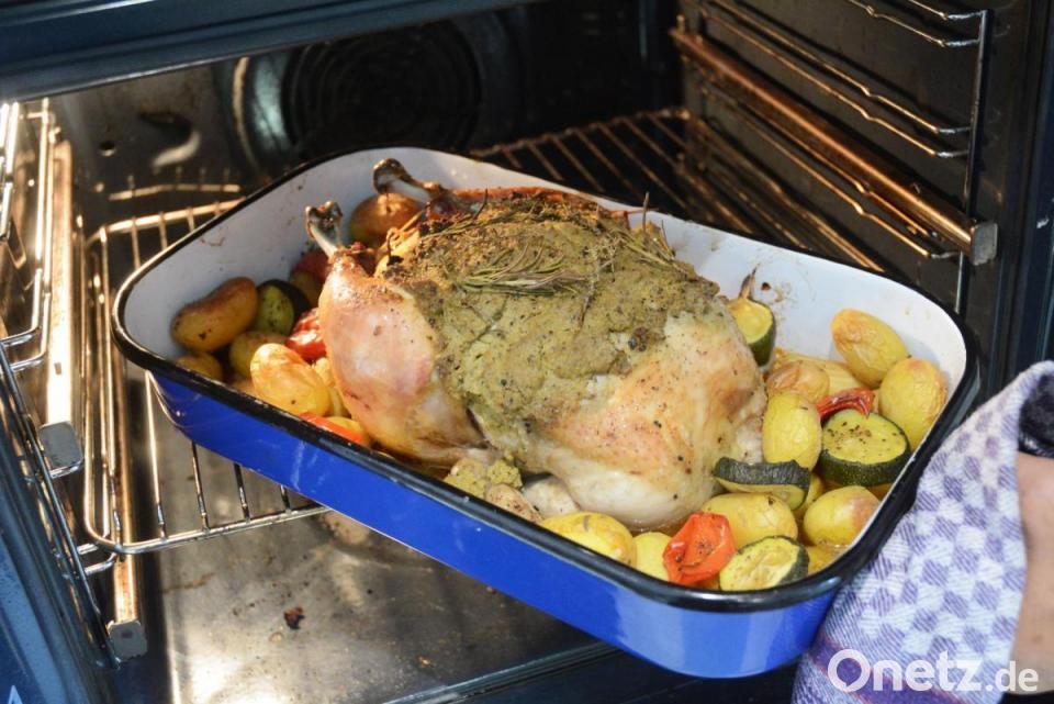 Die Oliven mit dem Pfeffer, der Knoblauchzehe und dem Olivenöl fein pürieren. Das Hähnchen waschen und trockentupfen. Die Paste in einen Spritzbeutel geben und unter die haut des Hähnchens spritzen. Dabei alles gut verteilen. "Die Haut vorne mit einem Zahnstocher zuhalten", so OWZ-Küchenchef Michael Schiffer. Die restliche Paste auf dem Hähnchen verteilen. Mit Rosmarin und Thymian bestreuen. Die Kartoffel waschen. Die Zucchini in grobe Scheiben schneiden. Die Paprika putzen und achteln. Das Hähnchen in eine Form geben und die Kartoffeln dazugeben. Das Ganze im vorgeheizten Backofen bei 180 Grad ungefähr 80 Minuten backen. Nach etwa 30 Minuten das Gemüse dazugeben. "Die Kruste ist einfach köstlich und die Kartoffeln und das Gemüse perfekt knusprig", schwärmt Schiffer.