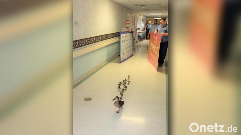 Entenmutter voran, Küken ordentlich hintereinander aufgereiht hinterher. In der freien Wildbahn ist das kein ungewöhnliches Bild. Auf den Fluren eines Krankenhauses sieht man das eher selten. Außer vielleicht im Krankenhaus "Thompson Health" in Canandaigua (New York, USA). Dort brütet jedes Jahr eine Ente in einem der Innenhöfe Eier aus. Ist es dann an der Zeit, dem Nachwuchs die weite Welt zu zeigen, klopft sie mit dem Schnabel gegen die Glastür. Dann macht das Personal den Weg frei und sorgt für sicheres Geleit in weite Welt. Wie gesagt: jedes Jahr.