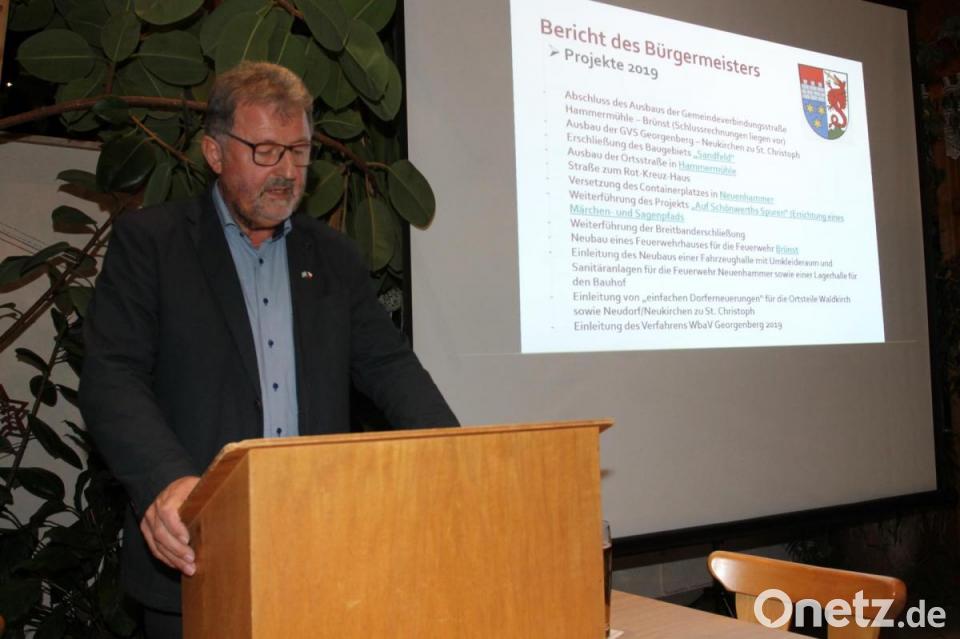 Bei den Projekten 2019 nannte Maurer neben mehreren Straßenbau-Maßnahmen unter anderem den Abschluss des Ausbaus der Gemeindeverbindungsstraße Hammermühle – Brünst, den Ausbau der Gemeindeverbindungsstraße Georgenberg – Neukirchen zu St. Christoph mit der Verlegung von neuen Wasserleitungen und Leerrohren für das Breitband, die Erschließung des Baugebiets „Sandfeld“, den Sagen- und Märchenpfad „Auf Schönwerths Spuren“, den Neubaubeginn des Feuerwehrhauses in Hinterbrünst, die Einleitung des Baus der Fahrzeughalle für die Feuerwehr Neuenhammer, die Instandsetzung des Aussichtsturms der Burgruine Schellenberg oder die in die Wege geleiteten Verfahren „Einfache Dorferneuerung“ für die Bereiche Waldkirch und Neukirchen zu St. Christoph / Neudorf.