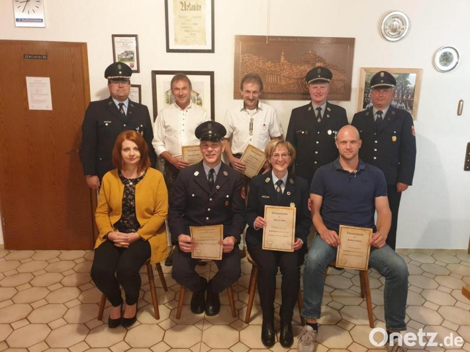 Das Treffen zur Weihe der neuen Tragkraftspritze nutzt die Feuerwehr Waldkirch auch zur Ehrung langjähriger Mitglieder. Vorsitzender Hubert Völkl, Kommandant Wolfgang Reber und Bürgermeisterin Marina Hirnet überreichten die Ehrenurkunden an Bernhard Träger, Konrad Träger (bei 40 Jahre), Marina Völkl, Christian Käs und Mattias Reber (alle 25 Jahre).