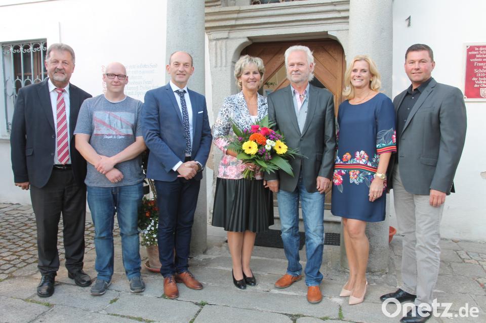 Nach fast 48 Jahren als Verwaltungsangestellter geht Alfons Zimmermann (Dritter von rechts, links daneben Ehefrau Kerstin) zum 1. Juli in den Ruhestand. Für die geleisteten Dienste bedankten sich VGem-Gemeinschaftsvorsitzender Rainer Rewitzer, Pleysteins zweite Bürgermeisterin Andrea Lang, Geschäftsleiter Günter Gschwindler, Personalrat Markus Friedl und der Georgenberger Bürgermeister Johann Maurer (von rechts).