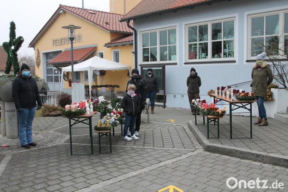 Der große Adventsmarkt konnte am Samstag zwar nicht über die Bühne gehen, etwas vorweihnachtliche Atmosphäre war auf dem Vorplatz des Rathauses dennoch angesagt. Warm eingepackt hat der Elternbeirat des Kinderhauses die bestellten Adventskränze an den Mann und die Frau gebracht.