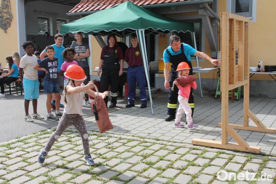 Beim Ausrollen der Wasserschläuche durften die Kinder selbst Hand anlegen. Dabei stellten sie fest, dass das gar nicht so einfach ist. Einige Meter entfernt standen neun Wasserflaschen in Kegelformation, die umgeworfen werden mussten. Gleiches galt beim Leinenbeutel-Zielwerfen. Nicht fehlen durfte natürlich auch der Einsatz mit der Kübelspritze.