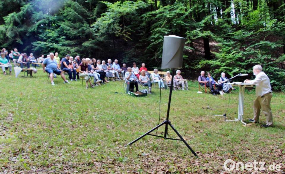 Alljährlich im August lädt die Landeskirchliche Gemeinschaft im Bezirk Hersbruck zu einem Gottesdienst im Freien auf die Waldlichtung zwischen Gerhardsberg und Schmidtstadt (Gemeinde Etzelwang, Landkreis Amberg-Sulzbach) ein. Prediger Arthur Meneikis von der Hersbrucker Gemeinschaft stellte den Referenten des Nachmittags, Inspektor i. R. Konrad Flämig aus Puschendorf, vor, indem er ihn kurz zu dessen persönlichem Werdegang interviewte. Peter Appel bekundete in einem Grußwort für die Kirchengemeinde Kirchenreinbach die langjährige Verbundenheit mit der Landeskirchlichen Gemeinschaft Hersbruck.