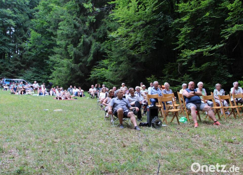 Fast wie in einer Arena verteilten sich die Besucher des Waldfests der Landeskirchlichen Gemeinschaft Hersbruck auf dem Hang der Waldwiese westlich von Gerhardsberg in der Gemeinde Etzelwang. Hohe Fichten am Rand der Lichtung spendeten ihnen Schatten, während sie die Andacht verfolgten. Die Lieder begleitete der Posaunenchor Kirchenreinbach, geleitet von Claudia Vogel.