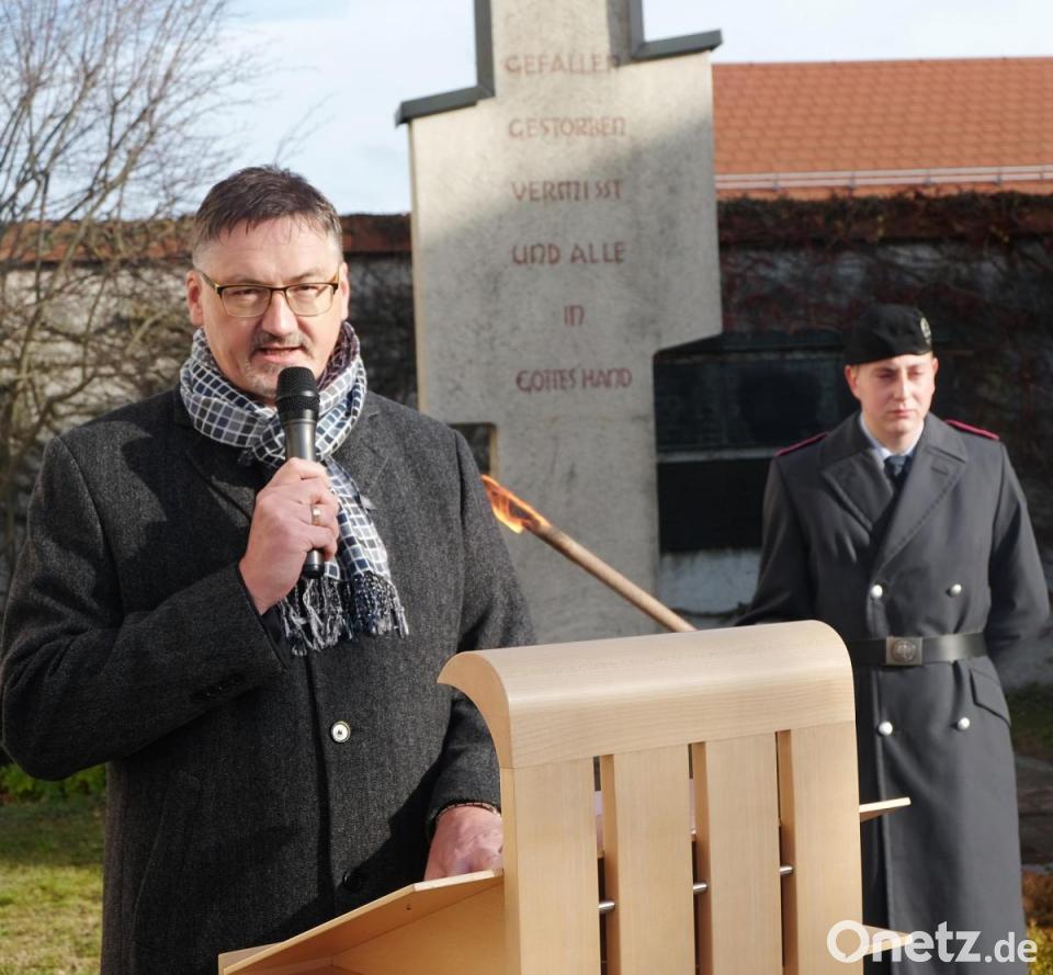 Mit Abstand zum Krieg verblasse die Erinnerung und die Gefahr bestehe, dass sich gegenüber dem Volkstrauertag Gleichgültigkeit anbahne, betonte Bürgermeister Hans Prechtl. Nur noch heute über 90-Jährige mussten als Soldat in den Krieg ziehen. Der Spruch auf der Fahne des Kriegervereins "Mortui viventes obligant" - Die Toten mahnen die Lebenden - verpflichte zur Verantwortung. "Wenn wir den Volkstrauertag als Mahnung zu Frieden, Demokratie und Gerechtigkeit verstehen, dann ist dieser Tag heute noch genauso aktuell wie Vater- und Muttertag", verdeutlichte Prechtl. Frieden sei keine Selbstverständlichkeit und könne nicht gekauft werden. "Frieden muss man spenden" - und zwar zwischen den Menschen und den Völkern. Dies gelinge in Europa recht gut. "Europa ist die größte Friedensbewegung unserer Zeit". Zweifler sollen Soldatenfriedhöfe besuchen. Aktuell gebe es 28 Kriege und bewaffnete Konflikte auf der Welt, merkt der Bürgermeister an. Seit 1992 haben auch 110 Soldaten der Bundeswehr ihr Leben im Auslandseinsatz verloren.