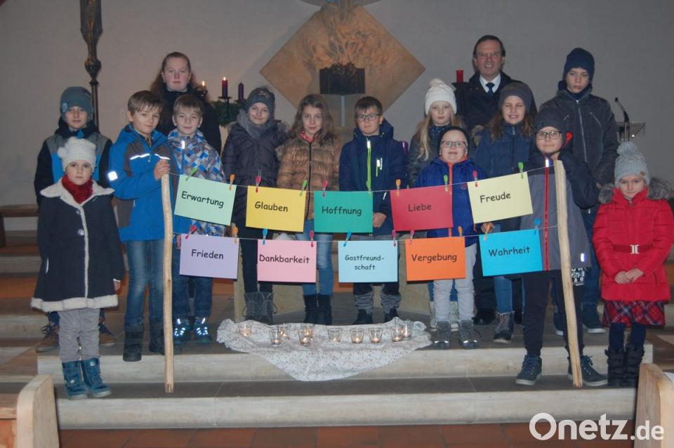 Stadtpfarrer Bernhard Müller erklärte, was damit gemeint ist: "Es werde Licht. Ist diese Bitte nicht zutiefst Ausdruck menschlicher Sehnsucht nach Heil und Erlösung, nach Leben und Licht, nach dem befreienden Gott?", fragte er in die Runde. Dann übergab er das Wort an Franziska, Philipp, Annika, die beiden Davids, Fiona, Daniel, Elisabeth, Dominik und Antonia. Die ließen Kerzen und Papptäfelchen sprechen: Es ging um Erwartungen, Glauben, Hoffnung, Liebe, Freude, Frieden, Dankbarkeit, Gastfreundschaft, Vergebung und Wahrheit, jeweils in Bezug auf Gottes Größe, Huld, Güte und das Wunder der Heiligen Nacht.
