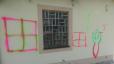 Granitsäulen und Kirchenmauer in Gmünd mit Farbe verunstaltet
