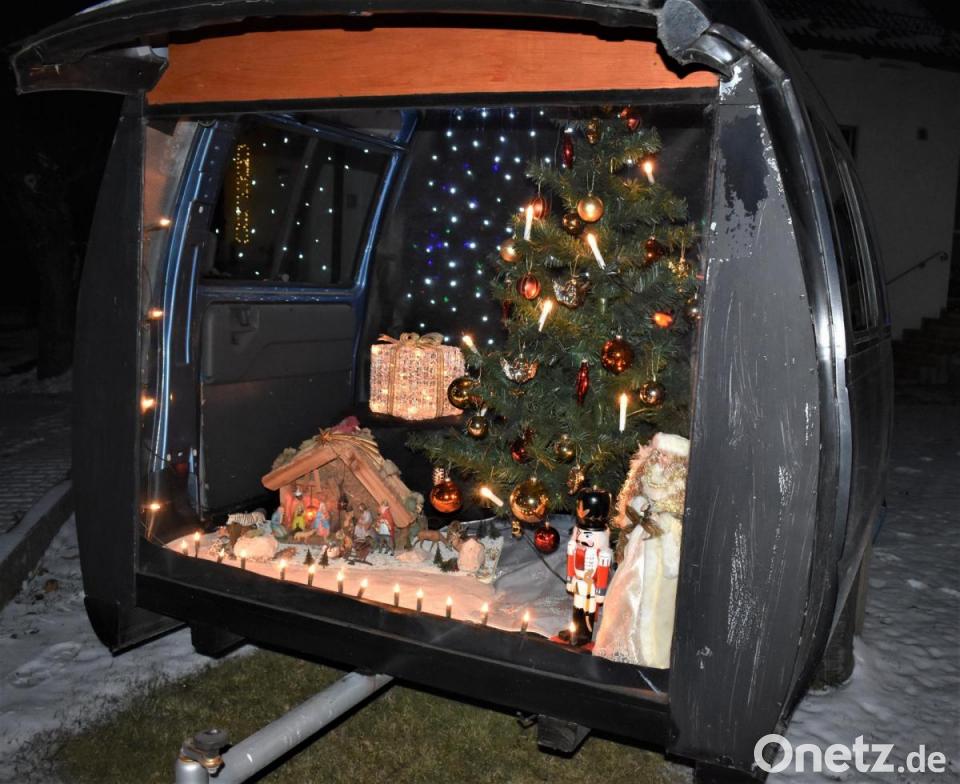 In der Vorweihnachtszeit gibt es viele Miniaturställe, in denen das Geschehen von Bethlehem nachgestellt wird. Dieser Stall für eine Weihnachtskrippe ist eher ungewöhnlich. An der Straße in Gößenreuth wurde in einem ausgedienten Auto Platz geschaffen, um weihnachtliches Flair zu verbreiten. Die Weihnachtskrippe mit Christbaum, Christkind und Nussknacker wird in der Dunkelheit mit vielen Lichtern erhellt.