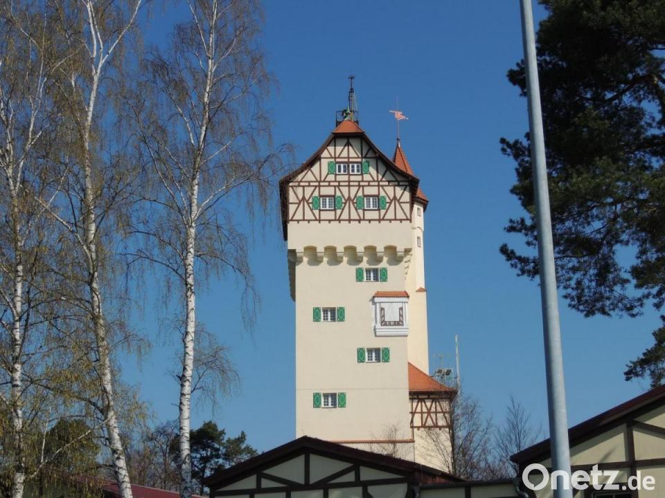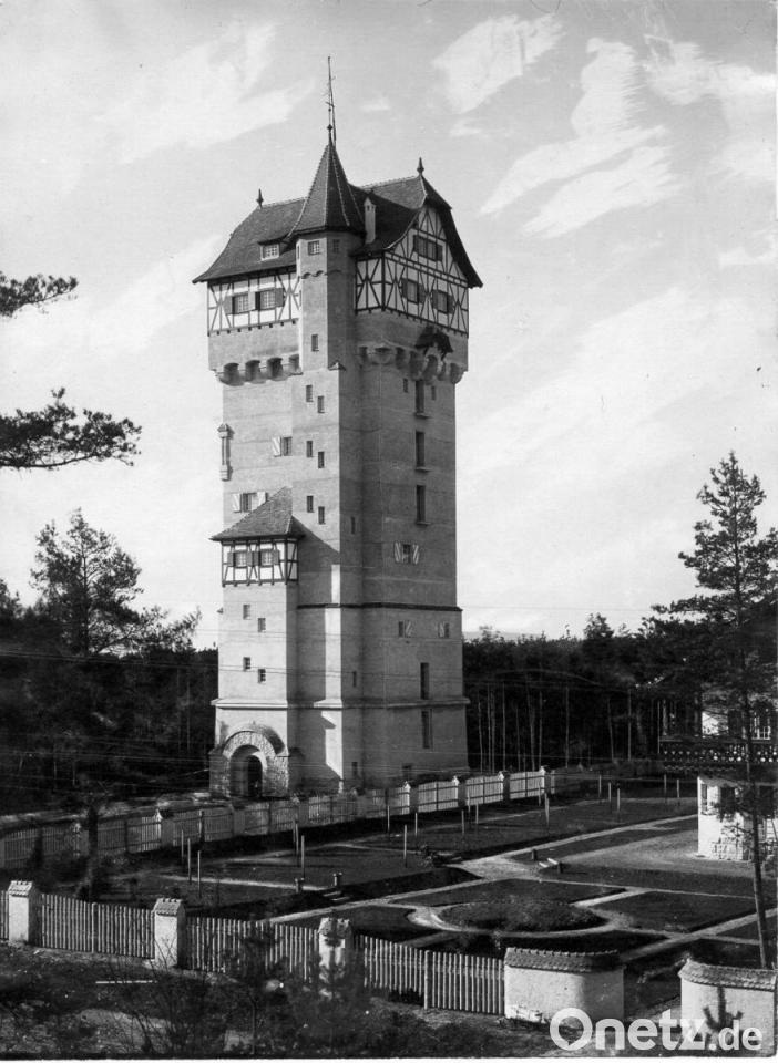 Gebaut wurde der 43,5 Meter hohe Turm zwischen 1909 und 1911 für die Wasserversorgung, noch heute sorgt ein 450 Kubikmeter fassendes Becken in der obersten Etage für den nötigen Leitungsdruck im Lager. Zusammen mit dem Forsthaus hat der Turm auch die zwei Luftangriffe 1945 unbeschadet überstanden, mehrmals wurde das Gebäude saniert, zuletzt musste die Kanonensilhouette auf dem Treppenturm im Jahr 2013 erneuert werden. Im Jahr 2010 wurden der Wasserturm und das Forsthaus in die Denkmalliste aufgenommen und sind somit staatlich anerkannte schützenswerte Bauwerke.
