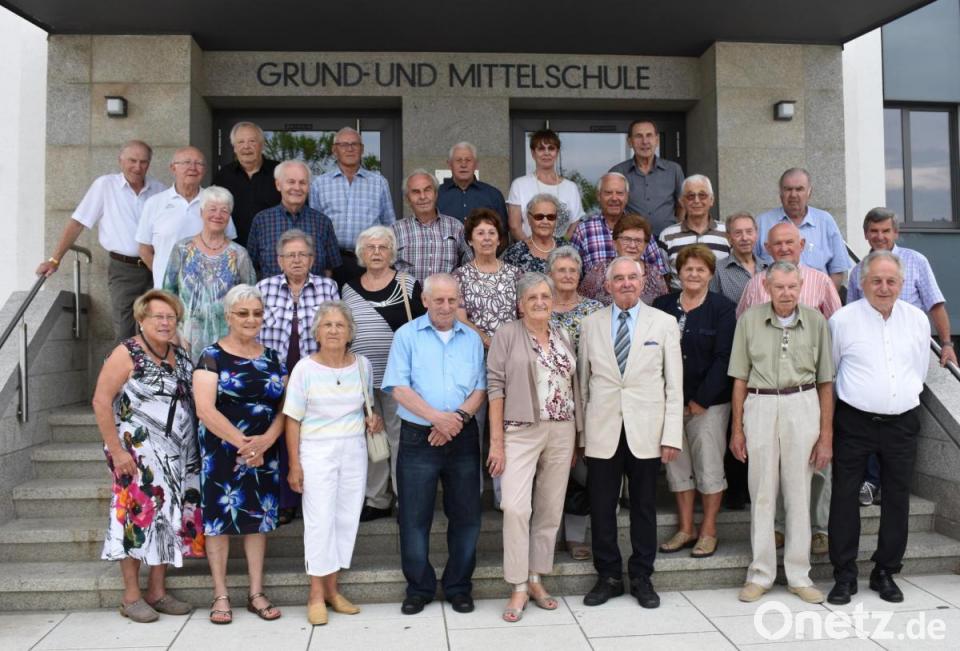 Die mittlerweile 80-Jährigen stellten viele Veränderungen fest, als sie die Grund- und Mittelschule in Grafenwöhr besichtigten. Rektor Thomas Schmidt führte die Gäste durch die Räume und erläuterte die Highlights der nun modernen Schule. Vor dem Schulgebäude wurde dann zum "Fototermin" gebeten. Im Gasthof/Hotel "Zur Post" tranken die ehemaligen Klassenkameraden Kaffee und plauderten beim Abendessen ausgiebig. Einige der Ehemaligen kamen sogar bis aus Berlin, Vilsbiburg und Passau in ihre Heimatstadt.