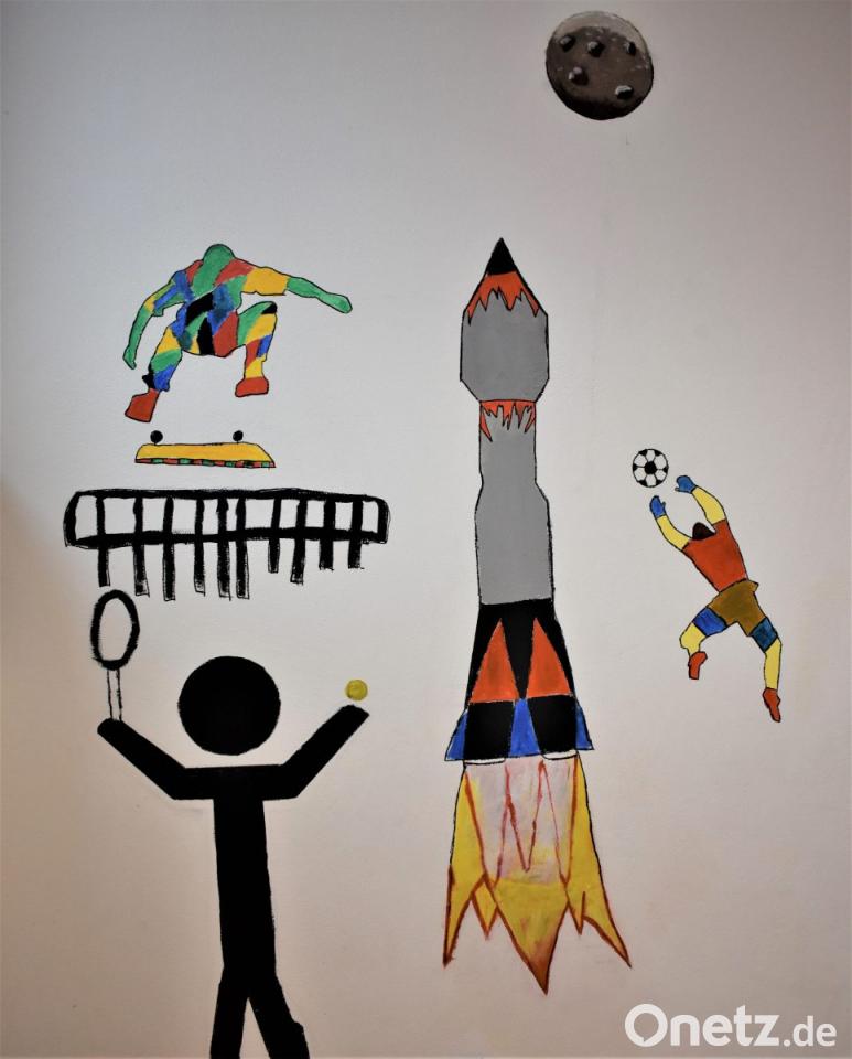 Entstanden sind Bilder, die zur Bewegung einladen und animieren, beispielsweise der Zielwurf oder der Weit- und Hochsprung. "Kreiert wurde eine kleine farbige und fantasievolle Welt für die jungen Nutzer des Bewegungsraums", lobte der Grafenwöhrer Künstler Johannes Janner, der die Schüler unterstützt und beraten hatte. Nach der Ideensammlung folgten Skizzen auf Papier und Bleistiftvorzeichnungen an Wänden.