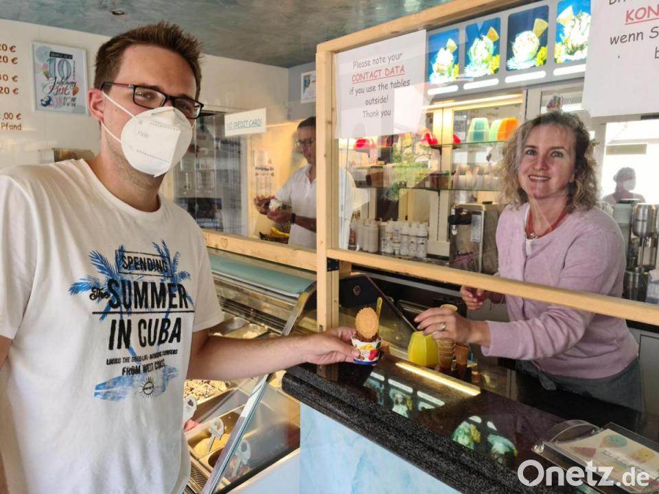 Trotz der wenig sommerlichen Temperaturen mit lediglich etwa 16 Grad und nur vereinzelten Sonnenstrahlen nahmen viele Menschen das Angebot in Anspruch, mit dem Lesercoupon aus dem Neuen Tag am Dienstag zwei Kugeln "abzustauben". Dazu gab es noch die Chance, bei einem Gewinnspiel Preise zu ergattern. Der Hauptgewinn dabei: ein Fiat 500 E Cabrio. Nach den zwei Aktionsstunden hatten die Leser insgesamt 168 Coupons eingelöst und sich so 336 Kugeln Eis gegönnt.