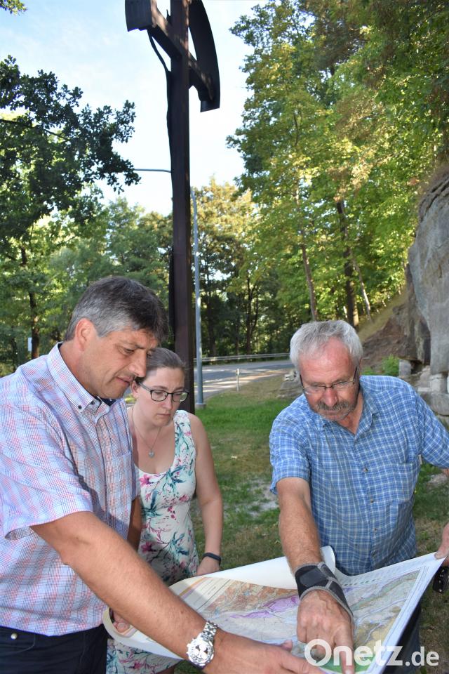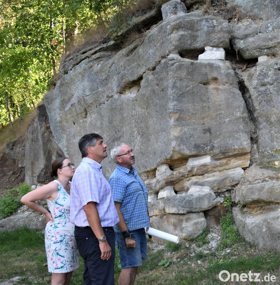 Kurz vor Abschluss der Maßnahmen trafen sich Bürgermeister Edgar Knobloch, Bautechnikerin Stephanie Zinn und Georg Doreth vom gleichnamigen Steinmetzbetrieb aus Neustadt am Kulm zu einem Gespräch bei den Sandsteinfelsen. "Nachdem schon einmal ein Felsbrocken heruntrkam, musste etwas unternommen werden", so das Stadtoberhaupt.
