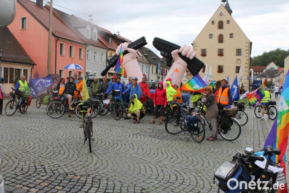 Die Tour der "Deutschen Friedensgesellschaft - Vereinte KriegsgegnerInnen", des "Friedensnetzwerkes Regensburg", des "Bundes für Geistesfreiheit" und der "Bürgerinitiative Keine Drohnen in der Oberpfalz" führte dieses Mal von Ulm bis nach Weiden. Eine der Stationen war auch Grafenwöhr mit seinem Truppenübungsplatz. Die 42 Radfahrer waren zuvor in Vilseck und machten dann Halt vor der Wache 3 in Grafenwöhr, um dort eine Weile zu demonstrieren. Anschließend führte der Weg weiter zum Marktplatz zu einer 45-minütigen Abschlusskundgebung mit einer riesigen aufblasbarer Skulptur.