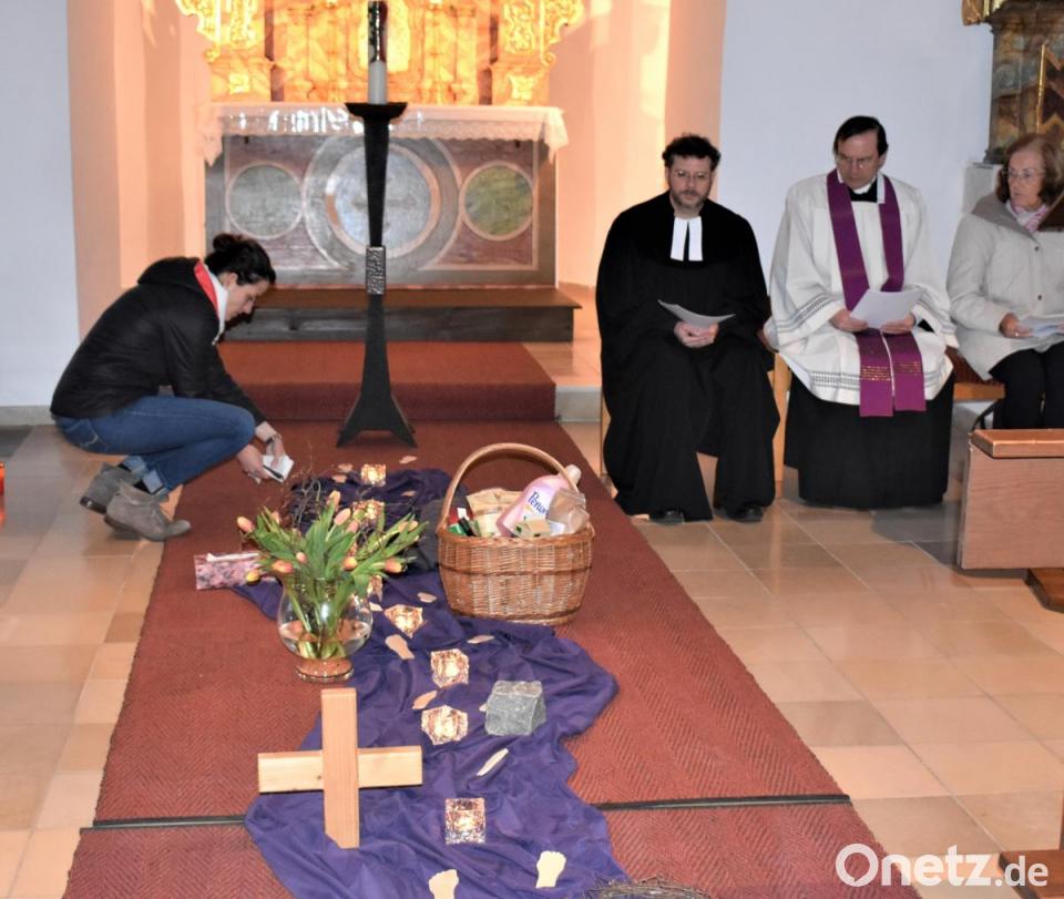 Gemeindereferentin Christine Gößl und Gemeindepraktikantin Laura Mauerer haben Symbole, wie beispielsweise eine Dornenkrone, ein Holzkreuz und einen Stein auf den Weg gelegt. Die Dornenkrone steht symbolisch für Sticheleien, die in Worten ausgedrückt werden. Urteile werden auch oft unüberlegt ausgesprochen. Bei Schicksalsschlägen werde gesagt, dass jeder sein Kreuz tragen muss. Steine lassen uns stolpern und fallen.
