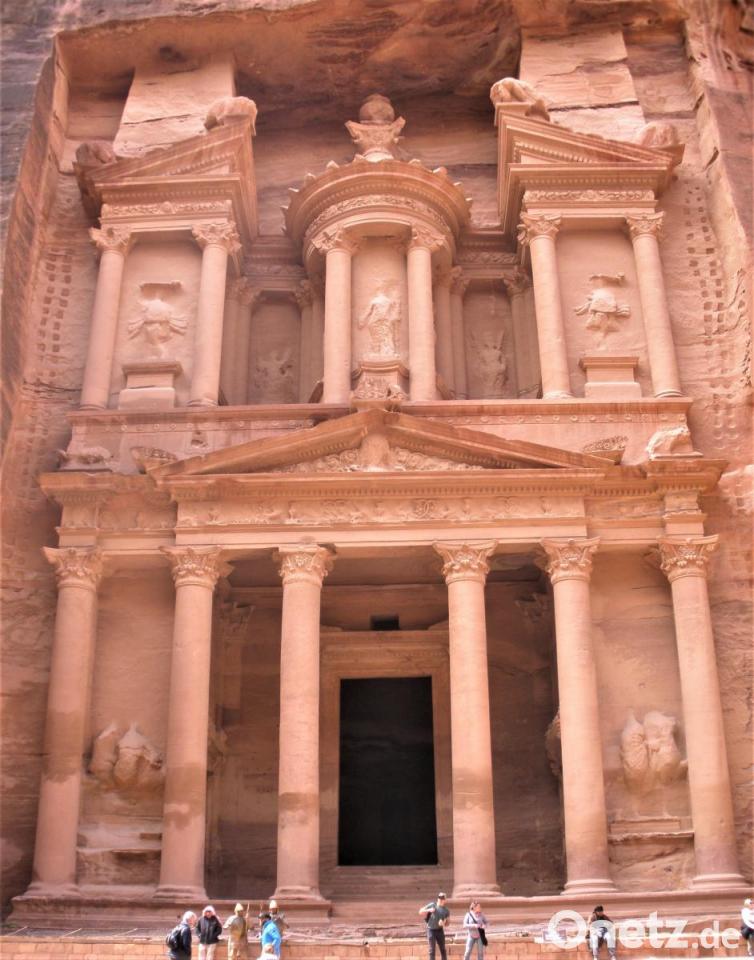 Höhepunkte der Reise sind natürlich der zweitägige Aufenthalt in der Felsenstadt Petra, von der die Erbauungszeit nicht bekannt ist. Die Hauptstadt der Nabatäer florierte ab dem 1. Jahrhundert vor Christus. Reich wurde sie durch den Handel mit Weihrauch, Myrrhe und Gewürzen. 363 nach Christus wurde die Stadt durch ein Erdbeben zerstört. 1812 machte sich der Schweizer Forscher Johannes Burckhardt auf die Suche nach der verlorenen Stadt und Petra wurde berühmt. Die Fassaden wurden aus rosafarbenem Sandstein herausgearbeitet. Es entstanden die wunderbarsten Formationen und in die roten Felsen gemeißelten Gräber. Aus der römischen Besatzungszeit stammen Tempel, ein Theater und Reste einer säulengeschmückten Prachtstraße. An beiden Wänden des Siq, einer schmalen Schlucht, verlaufen Wasserkanäle. Schon während des kilometerlangen Weges kann man nur noch staunen. Fasziniert ist man am Ende des Siq, beim 40 Meter hohen Schatzhaus (Al Khazna). Cheryl Frank, eine Reiseteilnehmerin aus Neustadt am Kulm, hatte ihr Buch von Marguerite van Geldermalsen dabei, in der sie ihre Ehe mit einem Beduinen beschreibt. "Ich wollte das Buch von der Autorin signieren lassen, da sie jeweils einige Monate im Jahr in Petra lebt", so Frank. Allerdings traf sie nur den Sohn der Autorin an.