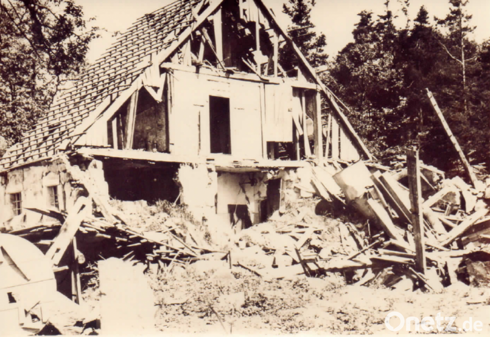 "Als die Luft endlich rein war, wagten wir uns nur zögerlich aus dem Keller. Welch' ein gespenstiger Anblick! Die schreckliche Bilanz: das Haus mit Mühle und Bäckerei – ein einziger Trümmerhaufen. Auch die Scheune, in der etwa 200 Zentner Getreide lagerten – zerbombt, zerstört bis auf die Grundmauern. Die anderen Gebäude, einschließlich Viehstall – ohne Dach. Schwer zu beschreiben, die Gesamtsituation, diese wirren Gefühle! Wie in Trance gingen wir umher. So unwirklich alles, irgendwie so leer. Selbst die Tränen waren uns abhanden gekommen... Unvergessen auch die Verwunderung dann über unsere eigenen Spuren. Weißer Staub, wohin wir auch traten: Bis wir kapierten – es war der Staub von zig Zentnern Mehl! Einer aber, der stand, wenngleich etwas verletzt, doch ungebrochen da: der gute, alte Holzbirnbaum. Seine starken 'Selbstheilungskräfte' wurden auch mit mehreren Bombensplittern fertig! Aber, wie der Baum aussah? Behängt mit Wäsche aller Art, sowie Fetzen von Mehl- und Getreidesäcken, die sich durch die Detonationen in seinem Geäst verfangen hatten. Eigentlich ein Bild zum Schmunzeln – ja, wäre die Lage nicht so makaber, nicht so erbärmlich gewesen. Wuchtige abgesprengte Felsblöcke versperrten den Weg. Sie mussten bald nach dem Bombardement, durch die pausenlos im Einsatz befindliche Feuerwehr beseitigt werden. Zudem forderten die Fahrer Martin Raß und Georg Hofmann auf, mit herumliegenden Brettern und Balken ein Provisorium über einen riesigen Bombentrichter an der Sandsteinbrücke zu installieren. An der Obag dann ein weiteres Hindernis. Dort brannte buchstäblich die Erde. Vermutet wurde damals der Abwurf von Phosphor."