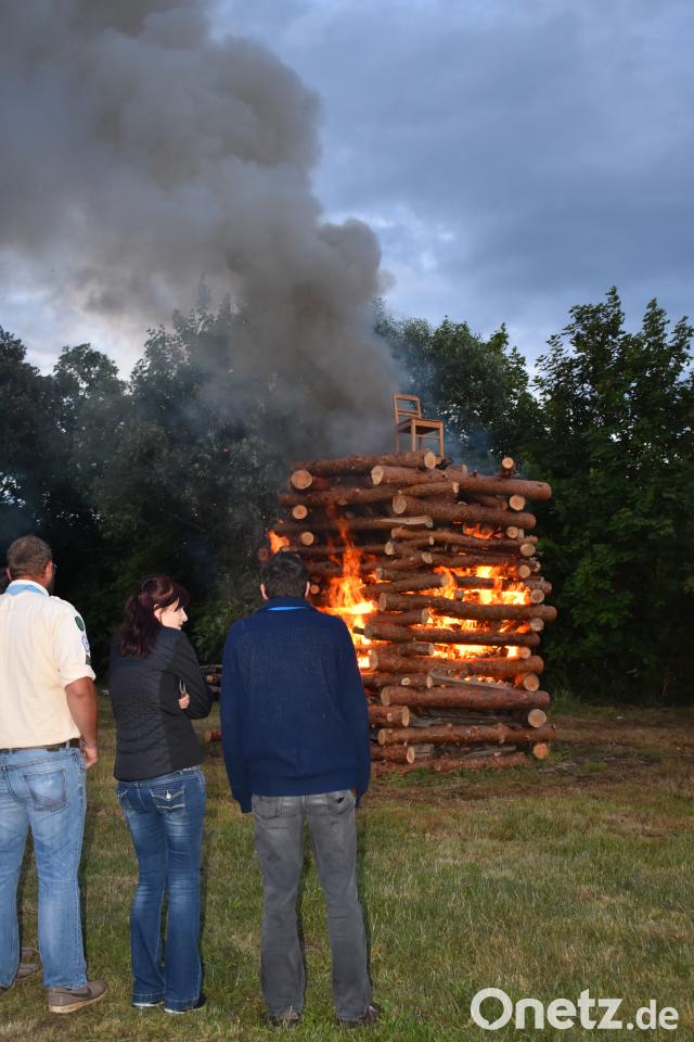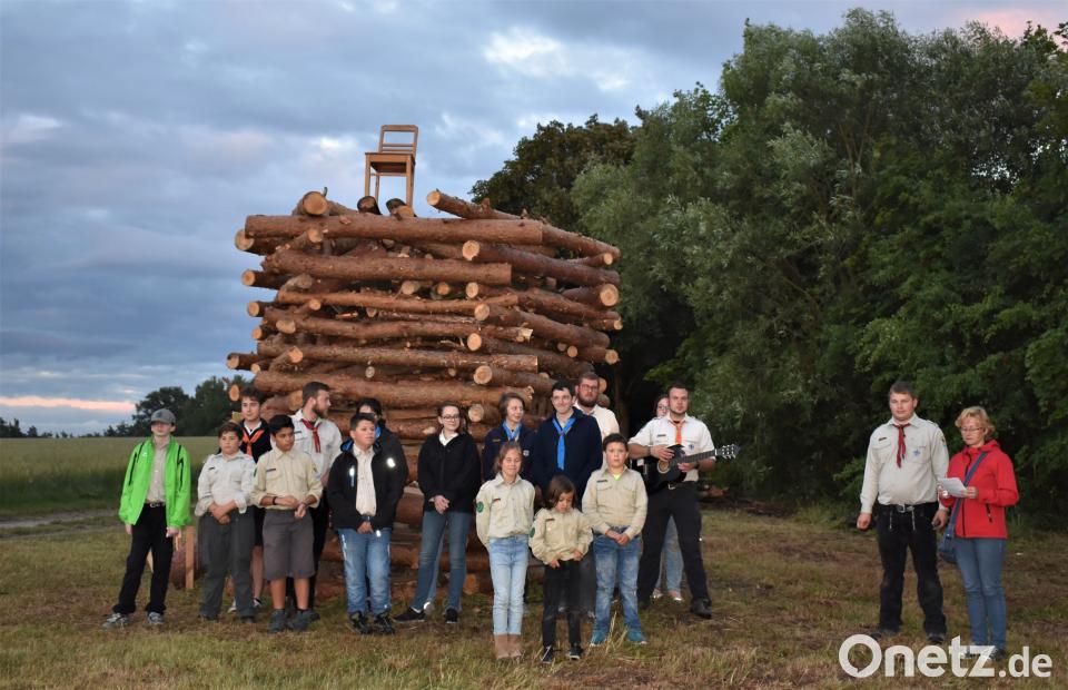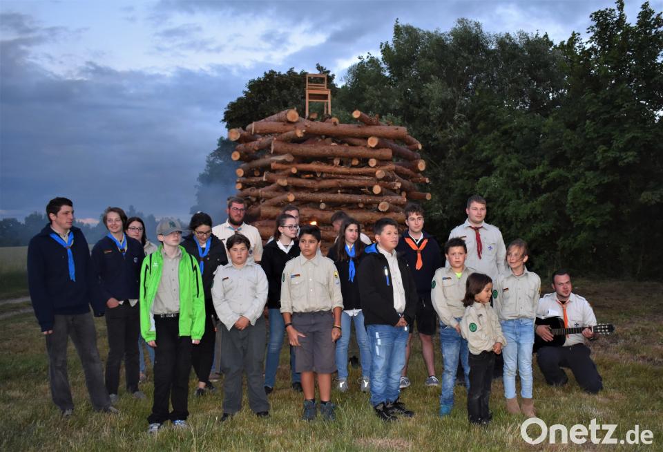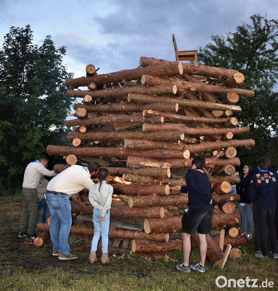 Nach dem etwas kleineren Holzberg im vergangenen Jahr wurde heuer ein 3,70 Meter hohen Berg aufgeschichtet. Traditionell wurde wieder ein Stuhl obendrauf gestellt. Stammesführer Lukas Zellner begrüßte die Gäste und bedankte sich bei allen Helfern. Sein besonderer Dank galt der Feuerwehr Grafenwöhr für die Feuerwache. Nachdem Gemeindereferentin Christine Gößl das Feuer segnete, sangen die Pfadfinder: "Und das Feuer, es brennt".