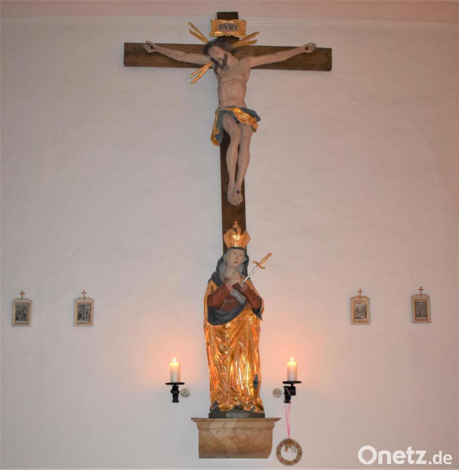 Die Statue der Mater Dolorosa trägt das Kopftuch einer verheirateten Frau. Der verstorbene Stadtmüller Thomas Sigert hatte der Friedhofskirche 15 Gulden hinterlassen. Pfarrer Sebastian Raith hatte das Geld in ein neues Kleid mit rotem Damast für die Schmerzhafte Mutter im Kreuzaltar investiert.