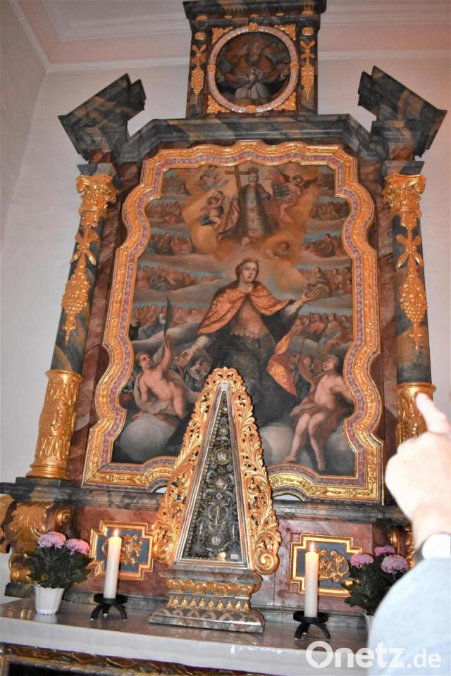 Der Nothelfer-Altar zeigt die 14 Nothelfer als Gemälde aus dem Jahr 1744. Die Verbundenheit der heiligen Ursula mit ihren Gefährtinnen werde durch die Verschmelzung von Schutzmantelmotiv und Segelschiff beim Ursula-Altar zum Ausdruck gebracht, erläuterte Böhm.