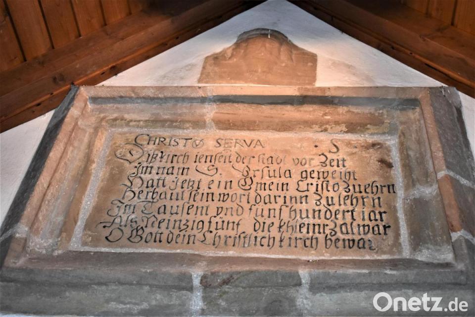 Nachdem Hößl die Schriftrillen schwarz nachgefahren hatte, konnte er folgendes lesen: "Christo servat diß Kirch/jenseit der Stadt vor zeit/In Nam S. Ursula geweiht! - Hatt jetzt ein Gmein Christo zu ehrn/herbaut, sein wort darinn zu lehrn/im Tausend und fünfhundertiar,/als neinzigfünf die khleinr zal war./O Gott, dein Christlich kirch bewar."