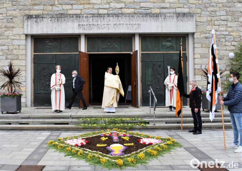 Kurzentschlossen hatten einige Frauen des Katholischen Frauenbundes in aller Frühe nach Absprache mit Pfarrer Bernhard Müller einen Blumenteppich vor der Friedenskirche gelegt. Schon vor dem Gottesdienst zog dieser bewundernde Blicke auf sich. "Fronleichnam ist das Fest, das uns nach draußen führt. Wir zeigen denjenigen, der unsere Mitte ist: Jesus Christus", sagte Pfarrer Bernhard Müller in seiner Predigt am Fronleichnamstag.