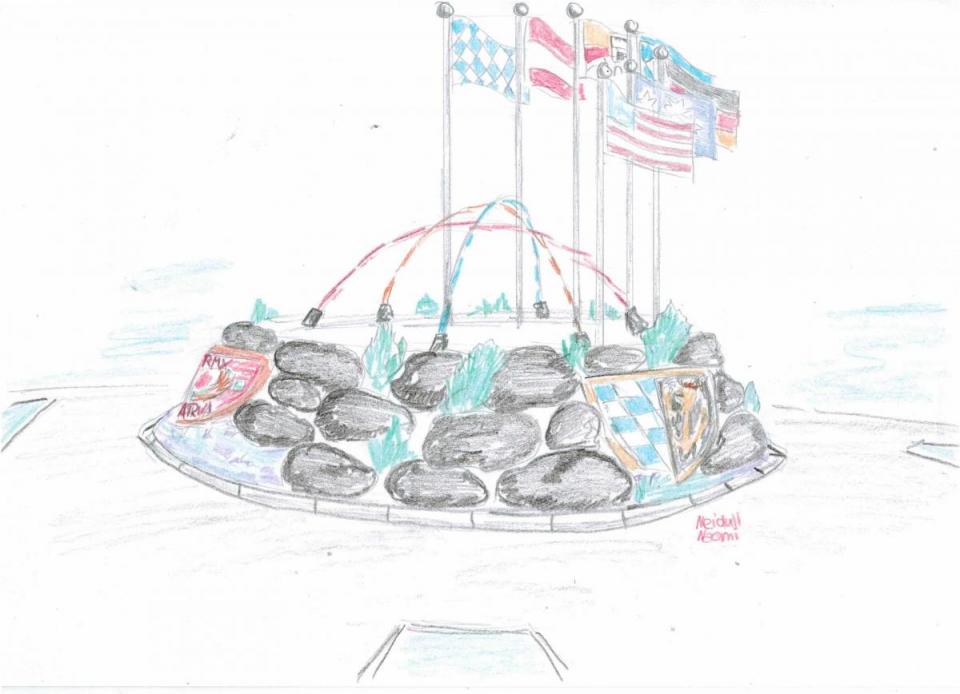 Dass Naomi Neidull aus Hütten nicht nur viel Fantasie hat, sondern auch noch künstlerisches Talent, zeigt sie mit ihrer E-Mail, die unsere Redaktion nach dem Leser-Aufruf, Gestaltungsideen einzusenden, erreicht. "Ich würde um die beleuchteten Wappen große Steine anbringen und dazwischen etwas Platz für schöne Sträucher lassen. An einigen Stellen auch etwas Freiraum für Blumen", schreibt die 13-Jährige zu ihrem selbstgemalten Bild. Außerdem wünscht sie sich auf dem Hügel des Kreisverkehrs Fahnenmasten, die im Halbkreis aufgestellt werden, und an denen Flaggen verschiedener Länder wehen. Unter anderem hat sie die deutsche, amerikanische und österreichische Flagge gemalt. Die Jugendliche findet auch farblich beleuchtete Wasserspiele gut. Sie stellt sich Wasserstrahlen vor, die aus mehreren Richtungen über den Hügel gespritzt werden - wie eine Kuppel. "Die Farben der Wasserstrahlen sollten gewechselt werden, je nach Feiertag: Independence Day rot-blau, bayerischer Feiertag blau-weiß. Die Bögen sollen das freundschaftliche Miteinander unserer Nationen symbolisieren. Wir sind bunt - das sieht jeder, der in Grafenwöhr ausgeht", schreibt Naomi zu ihrem Bild. Sie hofft, dass ihre Idee Früchte trägt.