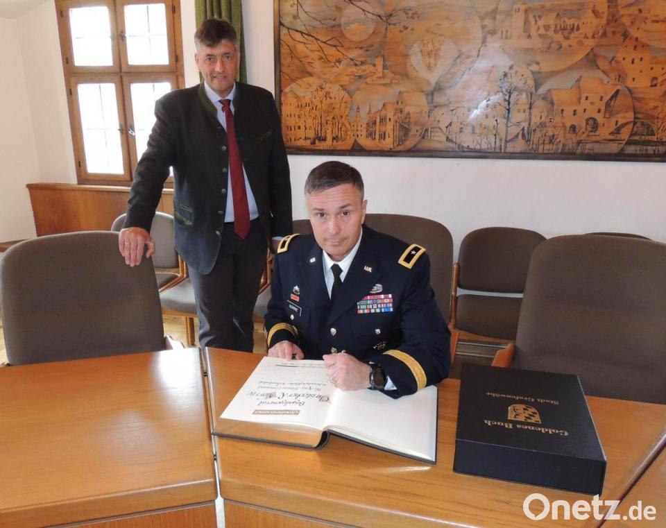 „Ich bin zutiefst dankbar, dass ich das Privileg hatte, hier dienen zu dürfen und so großartige Freunde an diesem speziellen Platz gefunden habe!“ schreibt Brigadegeneral Christopher R. Norrie in das Goldene Buch der Stadt Grafenwöhr. Beim Abschiedsbesuch im Rathaus richtet der Kommandeur des siebten US-Armee Ausbildungskommandos seinen Dank an die Bürger von Grafenwöhr und an Bürgermeister Edgar Knobloch.