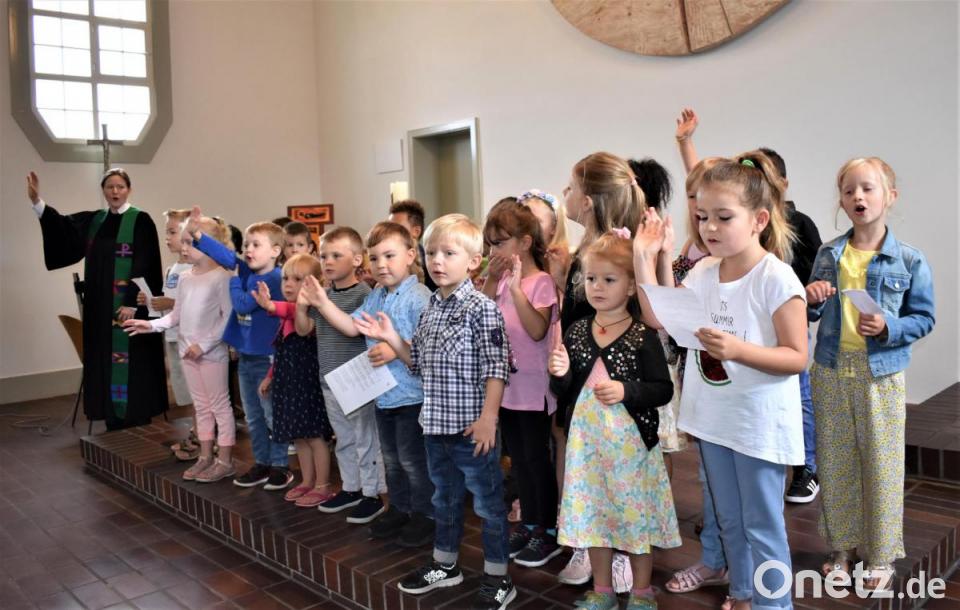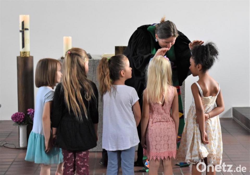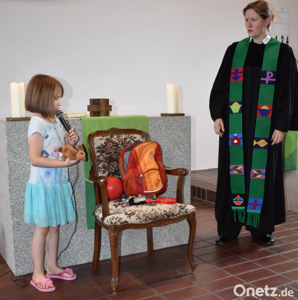 Da auch einige Kinder von der Kita in die Schule übertreten, packte ein Kind verschiedene Sachen aus, das es im Rucksack hatte: eine Lupe, einen Ball, ein Kuscheltier und auch Gott. Pfarrerin Utz segnete während des Gottesdienstes jedes Kind.