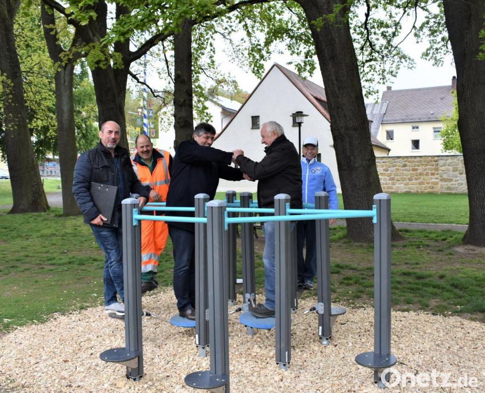 Bürgermeister Edgar Knobloch und Josef Neubauer weihten den Senioren-Sportpark ein. Mit dabei waren auch Stadtgärtnermeister Alexander Eismann, Techniker Oliver Fehr sowie Seniorenbeauftragter Karl-Heinz Wächter, auf dessen Initiative der Park entstand. "Geplant war er bereits seit einigen Jahren. Zuerst war der Standort beim Alten Forsthaus vorgesehen. Doch jetzt können Jung und Alt generationsübergreifend im Sportpark spielen und trainieren. Die Kosten belaufen sich auf 13.000 Euro", informierte Bürgermeister Edgar Knobloch. Fünf Fitnessgeräte wurden dazu im Stadtpark aufgestellt. Mit dem Pedaltrainer beispielsweise kann die Bein-, Rücken- und Armmuskulatur gestärkt werden. Wer das Stepgerät benutzt, erhöht seine Herzfrequenz. Auch ein Gerät, das gut für die Bauchmuskulatur, Balance so Körperhaltung ist, steht nun im Park.