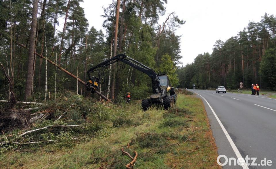 Es dauerte keine fünf Minuten und „Fabienne“ hinterließ Bild der Verwüstung. Im Bereich der Gemarkung Moos entlang der B 299 war es besonders schlimm: Straße und Radweg waren blockiert, eine Autofahrerin wurde in ihrem Fahrzeug eingeklemmt. Das Sturmtief machte weder vor Eichen, Föhren oder Fichten halt. „Das Chaos kann nur mit Maschinen beseitigt werden, für Holzfäller alleine ist es zu gefährlich“, lässt Forstamtsrat Martin Gottsche wissen. Die Firma Erthner aus Wildenreuth setzte einen Harvester ein, der mit Greifarm die Bäume fixierte und die Fallrichtung vorgab.