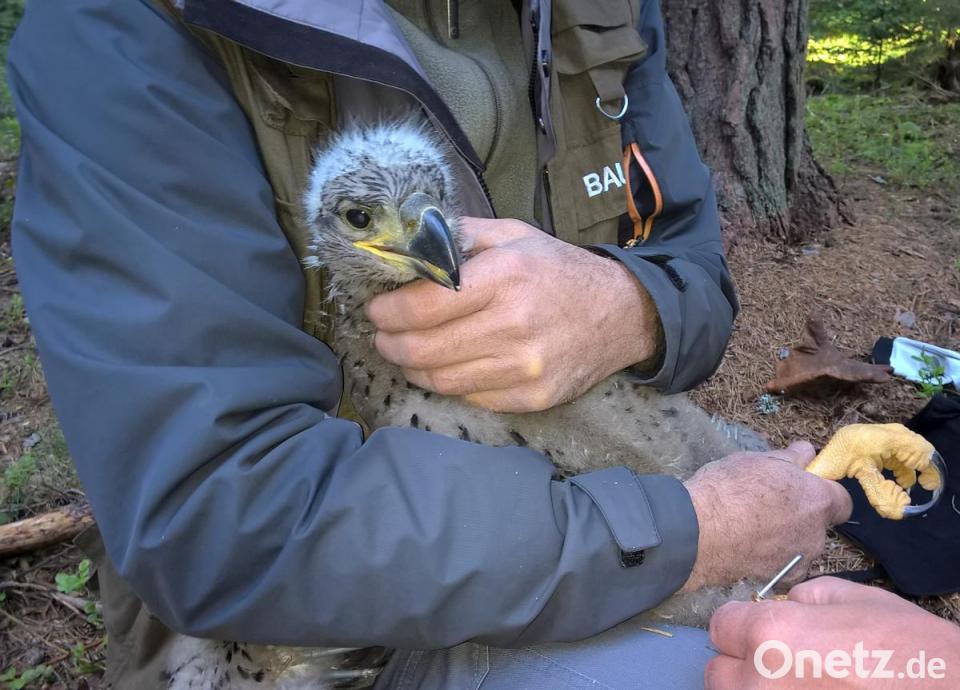 Für die Beringung muss der Jungvogel die passende Größe haben. Ist er zu klein, könnten die Ringe über seine Fänge rutschen. Bleiben sie an den Krallen hängen, wäre das das Todesurteil für das Tier, weil es dann seine Beute nicht mehr festhalten könne. Der etwa fünf Wochen alte Jungvogel in Grafenwöhr war groß genug. Er bekam an jedes Bein einen speziellen Ring mit Kürzeln. Entdeckt ein Vogelbeobachter den Seeadler, ist er eindeutig an den Ziffern auf den Ringen wiederzuerkennen. Gabriel tastete außerdem den kleinen Nestling am Kropf ab und wog ihn. 3,4 Kilo brachte der Vogel auf die Waage – gut genährt für sein Alter. Danach ging es mit Baumkletterer wieder zurück auf den Horst.