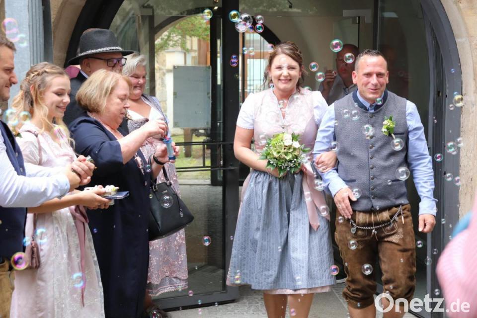 Durch einen Spalier aus Verwandten und engen Freunden schritt das strahlende – fesch in Dirndl und Lederhosen gekleidete – und frisch getraute Paar Tanja Beier und Matthias Schmeilzl-Beier in den Museumsinnenhof in Grafenwöhr. Zuvor gaben sie sich vor dem Standesbeamten Holger Cibis das Ja-Wort. Für zünftigen Sound sorgte unermüdlich der 15-jährige Marcel Benker aus Himmelkron am Akkordeon.