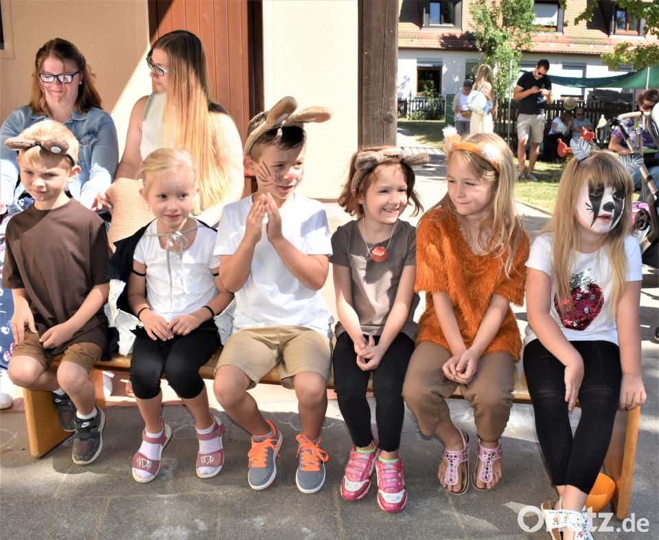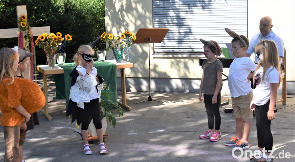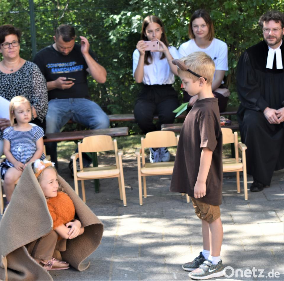 "Weil Gott die wunderbare Vielfalt liebt, hat er die Menschen kunterbunt erschaffen. Der eine kann gut rennen, der andere lesen oder zuhören. Jeder kann etwas gut und hat auch ein paar Macken. Im Kindergarten haben viele deutsch-, englisch-, russisch-, rumänisch- und tschechischsprachige Kinder Begleitung im Bildungsprozess erfahren. Das ist ein Grund zum feiern und Gott ist mit dabei", sagte Pfarrerin Utz. Die Vielfalt wurde besonders in einem Spiel der Kinder deutlich. - Der Bär Balduin wurde wegen seiner roten Knubbelnase "Himbär" genannt. Aber auch das Eichhörnchen und die anderen Tiere haben so ihre Eigenheiten. Aber schließlich werden alle akzeptiert.
