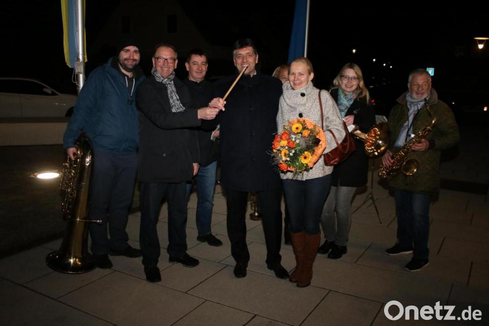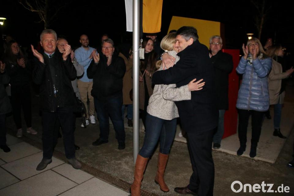 Nach der Verkündung durch Wahlleiter Lorenz Kraus folgte riesiger Jubel auf CSU-Seite. Erste Gratulantin war Knoblochs Ehefrau Gabriele. Die Stadtkapelle spielte einen Marsch. Der neue und alte Bürgermeister durfte für ein Lied sogar als Dirigent fungieren.
