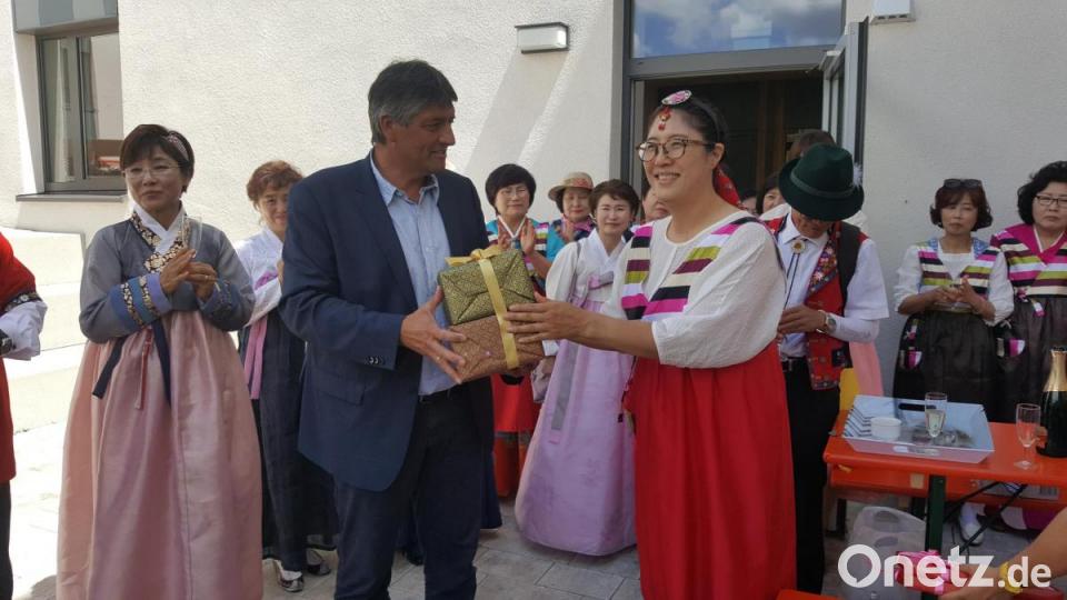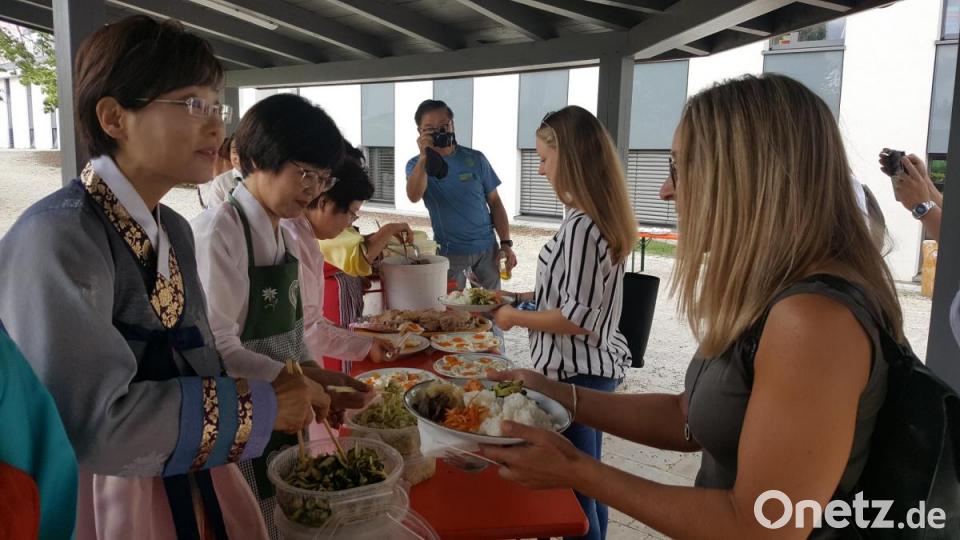 Mit traditionellem koreanischem Essen wollten die Gäste des Jodelclubs "Edelweiss" etwas von der erlebten Gastfreundschaft an die Gastgeber zurückgeben. Dafür bereiteten sie in der Küche der Mittelschule koreanische Speisen wie „Bibimbap“, ein Reisgericht mit viel Gemüse, und „Bulgogogi“ , geschnetzteltes Rindfleisch, zu und servierten sie den Grafenwöhrern anschließend. „Es schmeckt hervorragend“, waren sich die Bekochten einig und holten sich Nachschlag. Bei einem Sektempfang stieß Bürgermeister Edgar Knobloch mit den Gästen auf die bayerisch-koreanische Freundschaft an. Insoog Kim, die Vorsitzende des Jodelclubs, bedankte sich für die herzliche Aufnahme und überreichte Geschenke, bevor es eine Stadtführung gab. Dabei zogen die Gäste in den farbenprächtigen Gewändern die Aufmerksamkeit auf sich.
