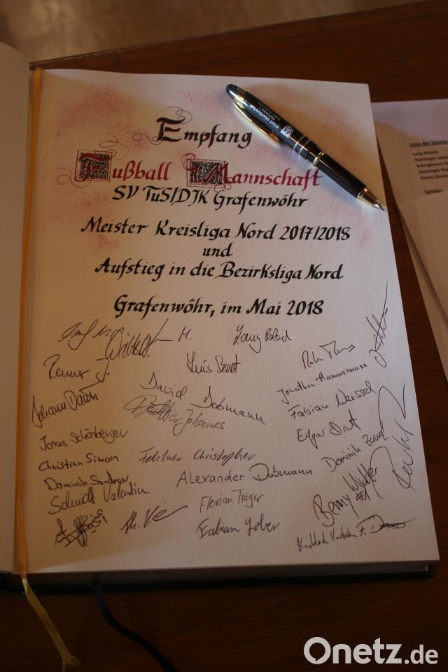 Die Abteilungen des SV Grafenwöhrs sind 2018 regelmäßig Gast im Rathaus. Nach den Tischtennisherren, zwei Kegelteams und den Volleyballdamen feierten nun auch die erste Fußballmannschaft den Aufstieg von der Kreis- in die Bezirksliga. Dazu gehört natürlich ein Empfang beim Bürgermeister im Sitzungssaal mit einem Eintrag in das Goldene Buch der Stadt, zu dem man standesgemäß mit einem Autocorso durch die Stadt reiste. Da das Rasenschach nach wie vor der beliebteste Sport mit den meisten Zuschauern ist, bezeichnete Edgar Knobloch den Erfolg der SVler als "Krönung des Aufstiegs".