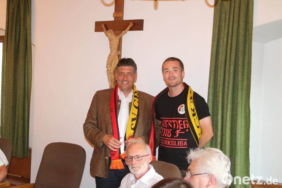 Thomas Reiter durfte in seiner Funktion als SV-Vorstand zum zweiten Mal nach neun Jahren einen Bezirksligaaufstieg miterleben. Er betonte, dass die junge Truppe hauptsächlich aus Einheimischen besteht und fast alle aus der eigenen Jugend stammen. Für die neue Saison hofft er auf einen guten Start und vielleicht kann Grafenwöhr sogar vorne mitspielen. Zum Abschluss bestätigte Spielführer Johannes Renner den Eindruck des Bürgermeisters, dass die Mannschaft gut zusammengewachsen ist. Als kleines Präsent erhielt der Rathauschef einen Schal des Vereins als Andenken an Team und Aufstieg.
