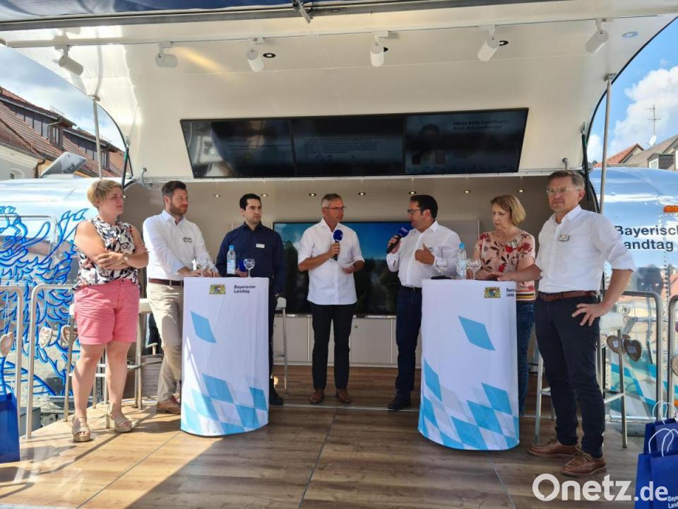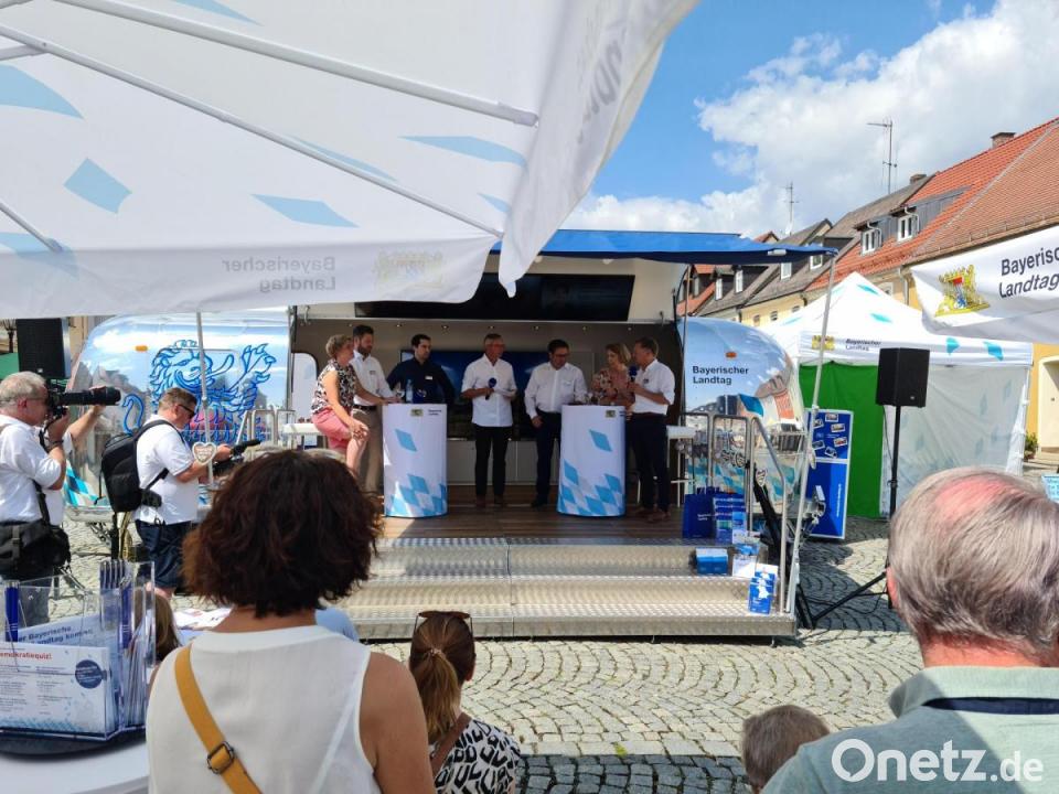 Auf dem Annamarkt war der Landtagstruck zu Gast – bei hochsommerlichen Temperaturen. Hitzig war auch der Schlagabtausch, den sich Landtagsabgeordnete aus der Region dort lieferten: Tobias Reiß (CSU), Anna Schwamberger (Grüne), Tobias Gotthard (FW), Stefan Löw (AfD), Annette Karl (SPD) und Christoph Skutella (FDP).