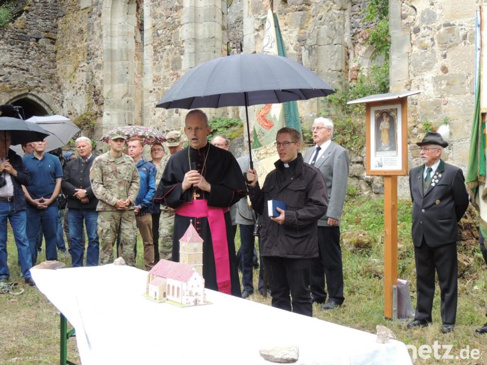 (mor) "Es ist gut für Menschen, zu dem Platz zurückzukommen, wo sie beheimatet waren und sich der Frau zuwenden, die uns den Herrn geboren hat", sagte Weihbischof Reinhard Pappenberger bei seiner Predigt vor Ruine der Kirche Maria Himmelfahrt in Pappenberg. Den rund 500 Teilnehmern des Besuchs im ehemaligen Wallfahrtsort legte er dabei das Bekenntnis zur Gottesmutter und die Symbolik des Walnussbaumes ans Herz. Die Absiedelung vor 80 Jahren war Anlass für die Sonderfahrt ins Sperrgebiet (wir berichteten). Weihbischof Pappenberger stellte vor der Kirchenruine, die einst das Gnadenbilder der "Schwarzen Madonna" von Pappenberg beheimatete, die Gläubigen unter den Schutz der Gottesmutter.