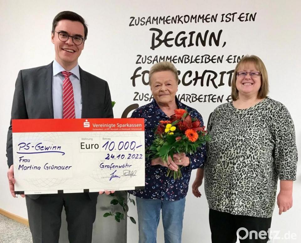 Eine besondere Überraschung hatten Martina Buchfelder und Michael Schelkshorn von der Sparkassen-Geschäftsstelle in Grafenwöhr für Martina Grünauer aus Schwarzenbach. Seit vielen Jahren beteiligt sich die Schwarzenbacherin am PS-Sparen der Vereinigte Sparkassen. Nun wurde sie dafür belohnt.