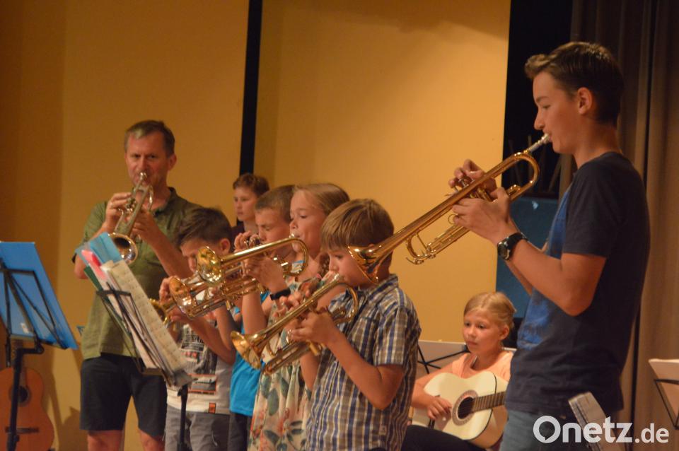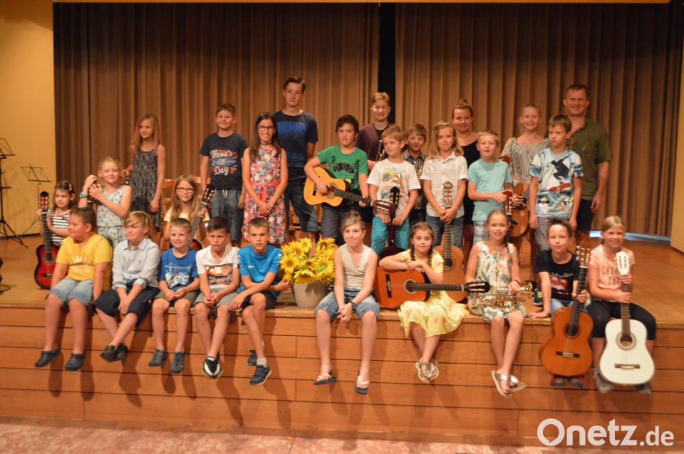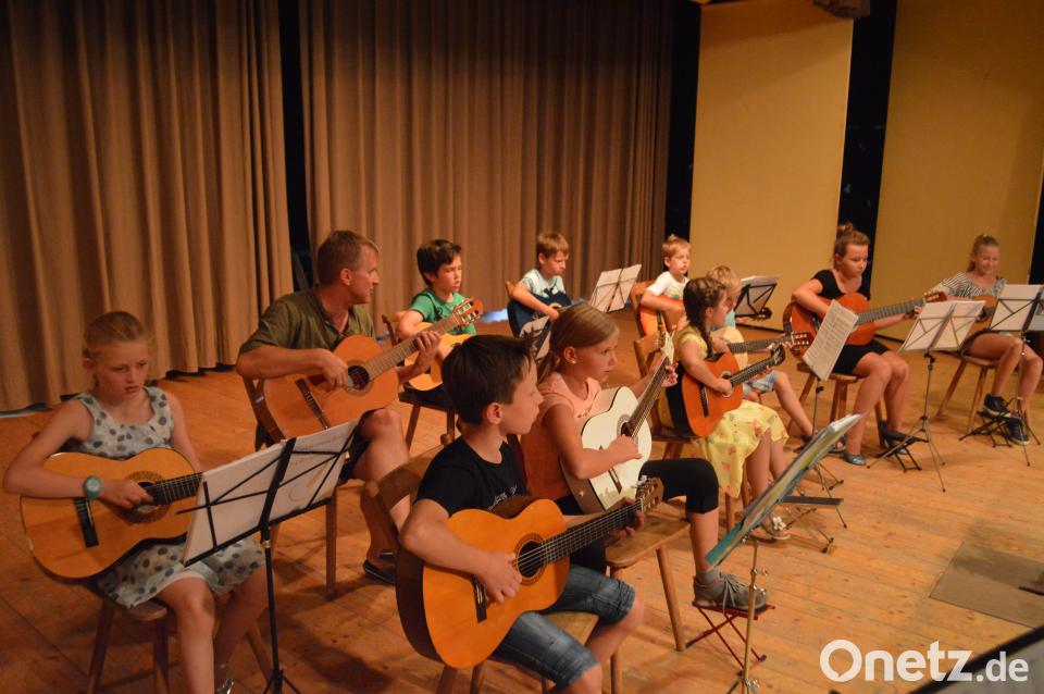 (myd) Die Eltern zeigten sich begeistert von dem breiten Repertoire, das die jungen Musiker zu bieten hatten.Ob internationale Kinder- und Volkslieder, Musical, Klassik, Pop oder Rock´nRoll, für jeden Geschmack war etwas dabei. Kilian Denk beeindruckte bei seinem ersten Auftritt mit zwei Stücken an der Trompete. Die erst fünfjährige Hanna Speckner spielte souverän zwei Kinderlieder auf der Gitarre. Neben einer weiteren Reihe von Solobeiträgen ließen die Kinder auch im Duett oder Ensemble die Gitarren erklingen. Dabei waren die Gruppen immer neu zusammengestellt. Durch gute Vorbereitung und Übung fiel es den Musikern nicht schwer, auch zu dritt, zu siebt, oder sogar zu neunt in der Gruppe den richtigen Rhythmus zu finden.