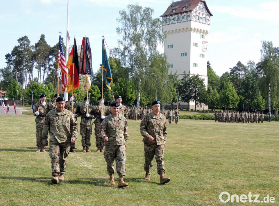 Mit großen Schritten auf zu neuen Wegen: Brigadegeneral Christopher C. LaNeve (rechts) ist der neue kommandierende General des 7. US-Armee Ausbildungskommandos (7th ATC) in Grafenwöhr. Brigadegeneral Antonio A. Aguto Jr. (links) nimmt ein Kommando in Fort Bragg in North Carolina wahr. Der Oberkommandierende des US-Heeres in Europa, Generalleutnant Christopher G. Cavoli (Mitte), übernahm die Kommandoübergabe. Bild: mor