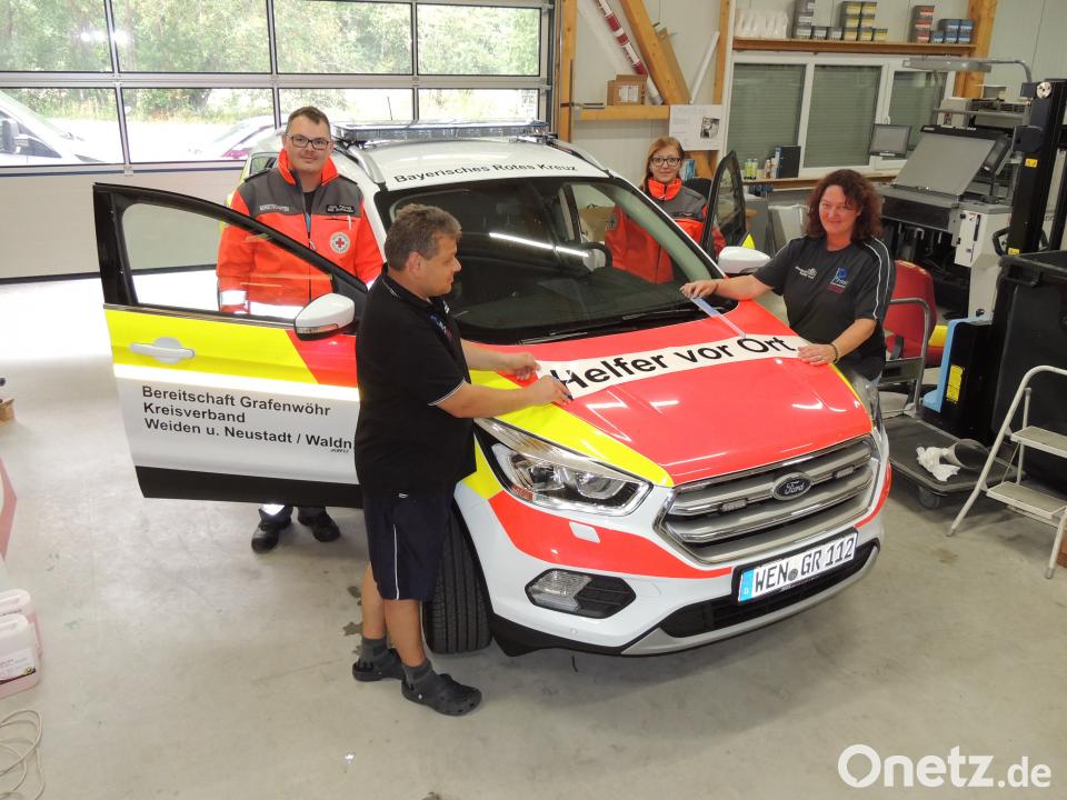 In der Druckerei Hutzler in Grafenwöhr wurde der weiße Ford nun mit der auffälligen Markierung und Beschriftung für Einsatzfahrzeuge beklebt. Tanja und Bernd Hutzler, der selbst als HVO mit die Einsätze fährt, ergänzten damit ihre Spende und Unterstützung, die sie bereits mit den Drucksachen für die Spendenaktion starteten. Als nächstes erfolgt der Heckausbau zur Verstauung der Rettungssätze, dann steht das HVO-Auto für die Einsätze bereit. Teile der Ausstattung sowie Versicherung und den laufenden Unterhalt für das HVO-Auto werden vom BRK-Kreisverband getragen. Patrick Hößl und seine Truppe sind immer noch überwältigt von der großen Spendenbereitschaft und lädt alle Gönner und die Bevölkerung schon jetzt zur Segnung und Inbetriebnahme des Fahrzeuges ein. Das Fest wird am Sonntag, 12. August 2018 am BRK-Heim steigen.