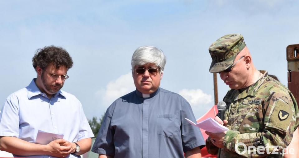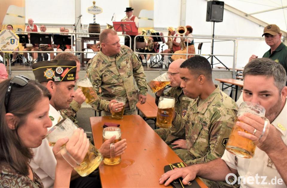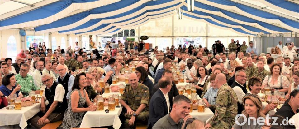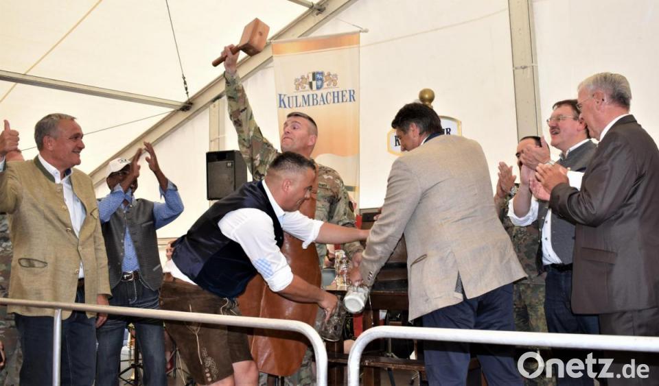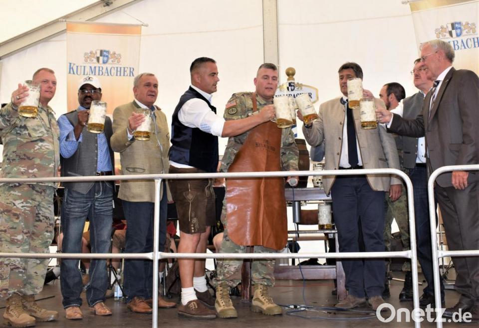 Mit nur einem Schlag floss der Gerstensaft danach aus dem Zapfhahn. Oberst Boyd verkündete im Oberpfälzer Dialekt: „O’zapft is!“ Gebete für eine gute Veranstaltung sprachen die Pfarrer Chris Kopec, Thomas Jeschner sowie André Fischer.